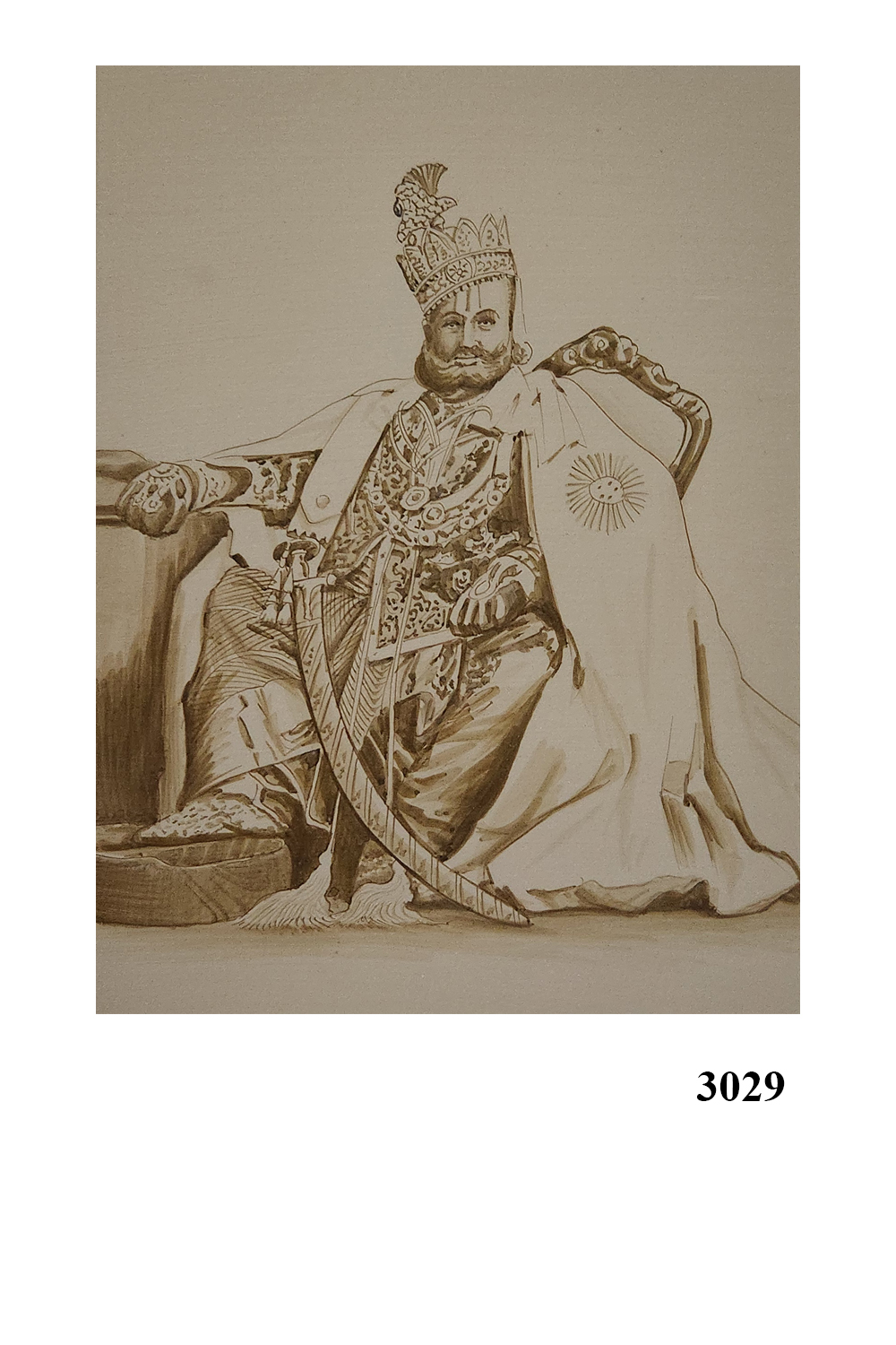 This sepia-toned watercolor painting captures the essence of regal elegance through its intricate depiction of a majestic figure seated on an ornate throne. The figure is adorned in traditional attire, featuring elaborate patterns and embellishments that highlight the grandeur of royal heritage. A prominent crown rests on the figure's head, symbolizing authority and power. The figure's posture and the ceremonial sword they hold add to the commanding presence. The sepia tones lend a vintage and timeless quality to the artwork, making it a captivating piece that evokes historical grandeur.
