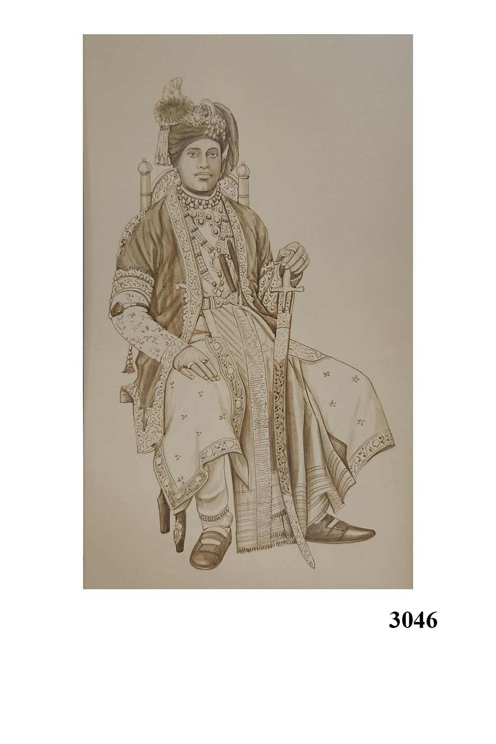 A seated figure in traditional royal attire, exuding authority and grace.