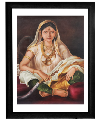 A regal woman in traditional Indian attire sits poised with a sword, embodying grace, strength, and timeless heritage.