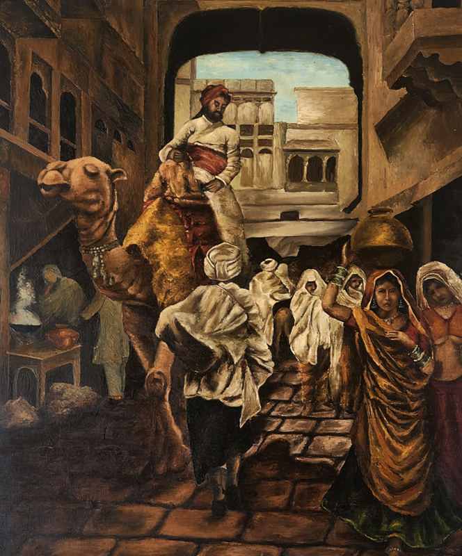 An intricate oil painting depicting a traditional Indian balcony with ornate architectural details.