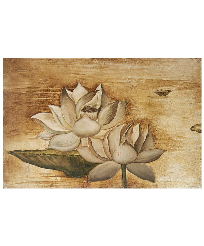 An elegant oil painting depicting two serene lotus flowers in full bloom against a textured background.