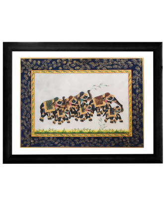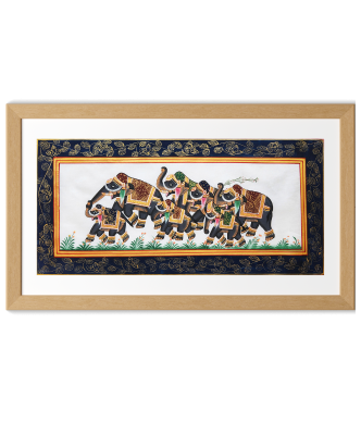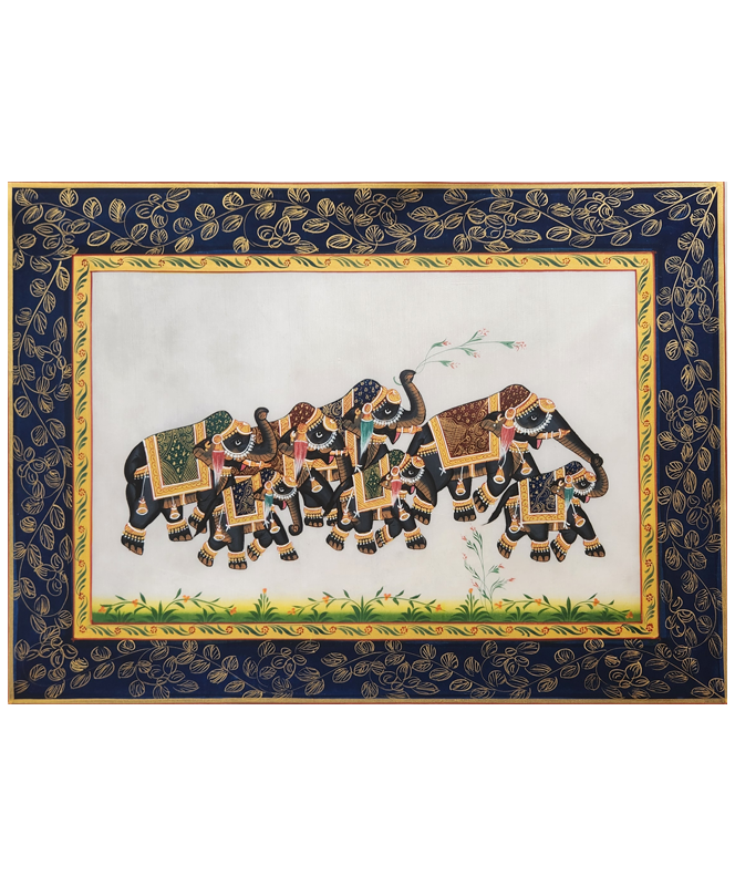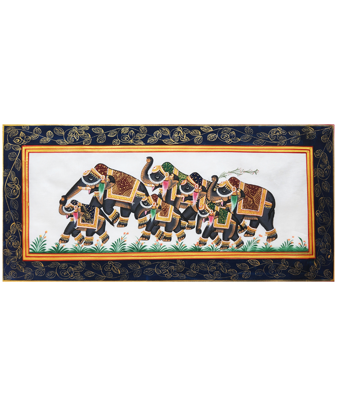 A traditional silk masterpiece capturing a royal elephant march, painted using original mineral pigments that evoke regal depth and vibrancy.
