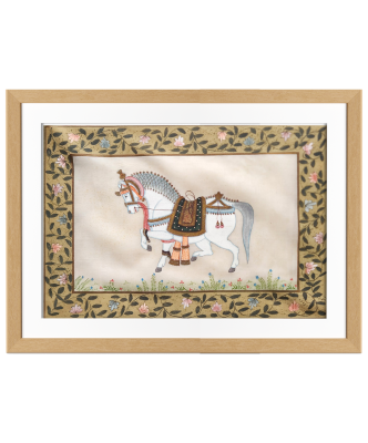 A compact yet striking silk artwork portraying a stately horse in ceremonial adornments, hand-painted using original mineral pigments.
