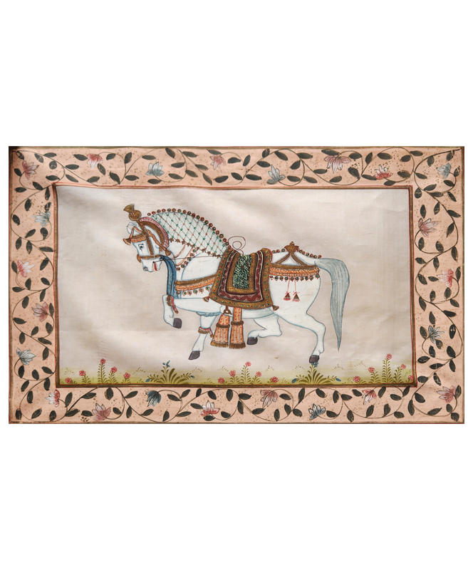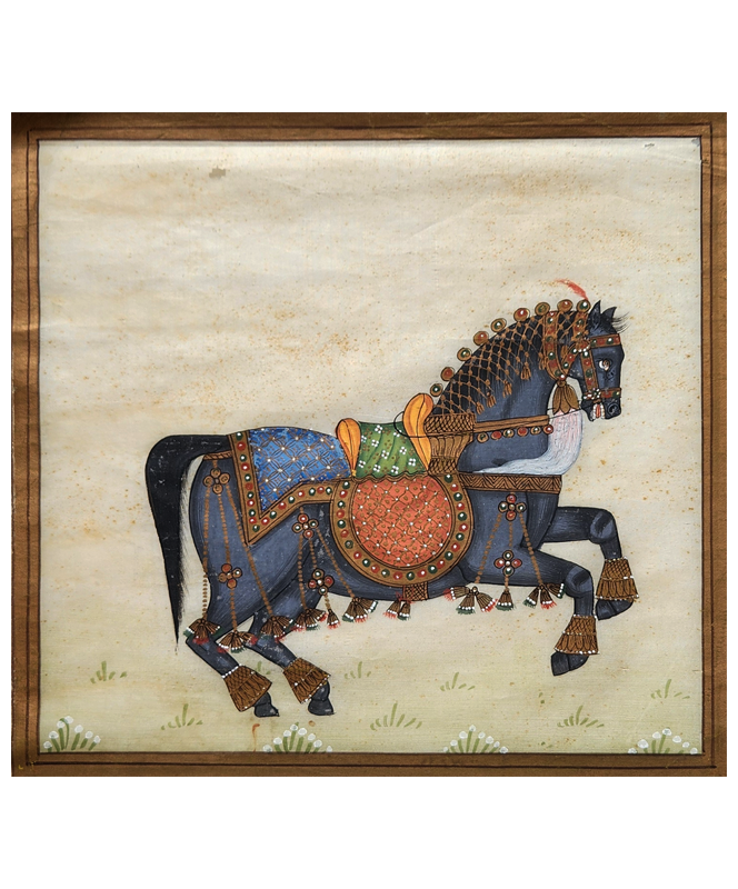 A refined silk painting depicting a ceremonial horse adorned in royal trappings, brought to life through authentic mineral pigments.