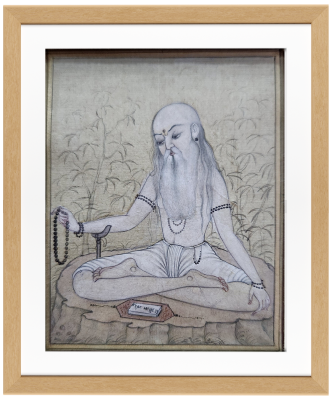 A detailed miniature painting depicting a sage in a meditative pose with various objects around.