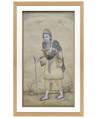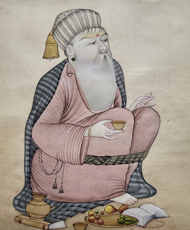 A detailed Indian miniature painting depicting an ascetic holding a bowl and staff, surrounded by nature.