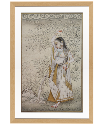A detailed miniature painting depicting a lady in traditional attire, set against a lush, intricate background.