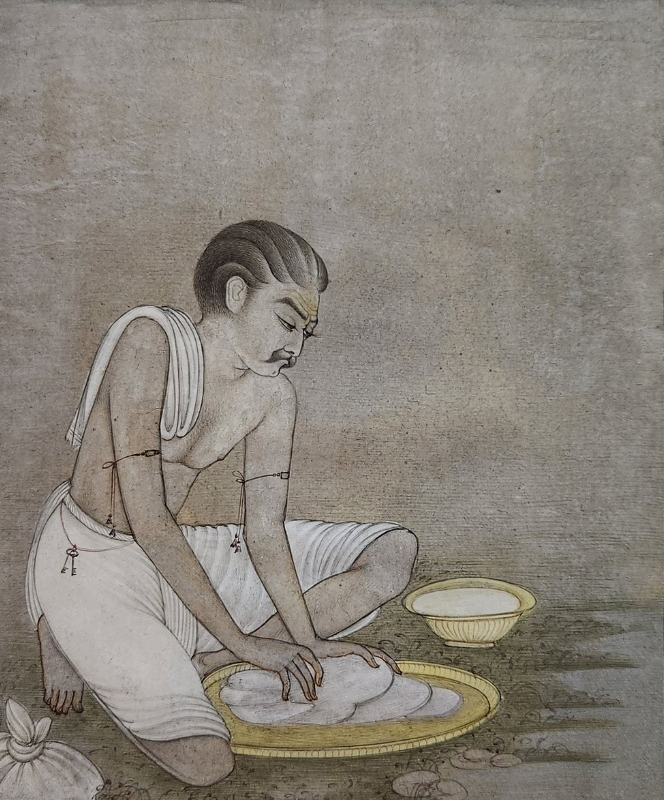 A traditional washerman is depicted washing clothes in this detailed miniature painting.