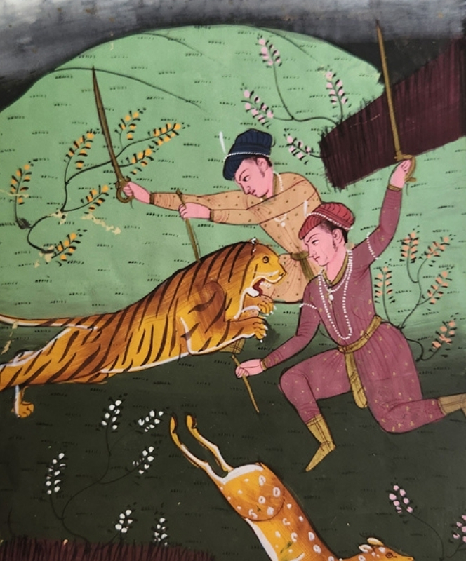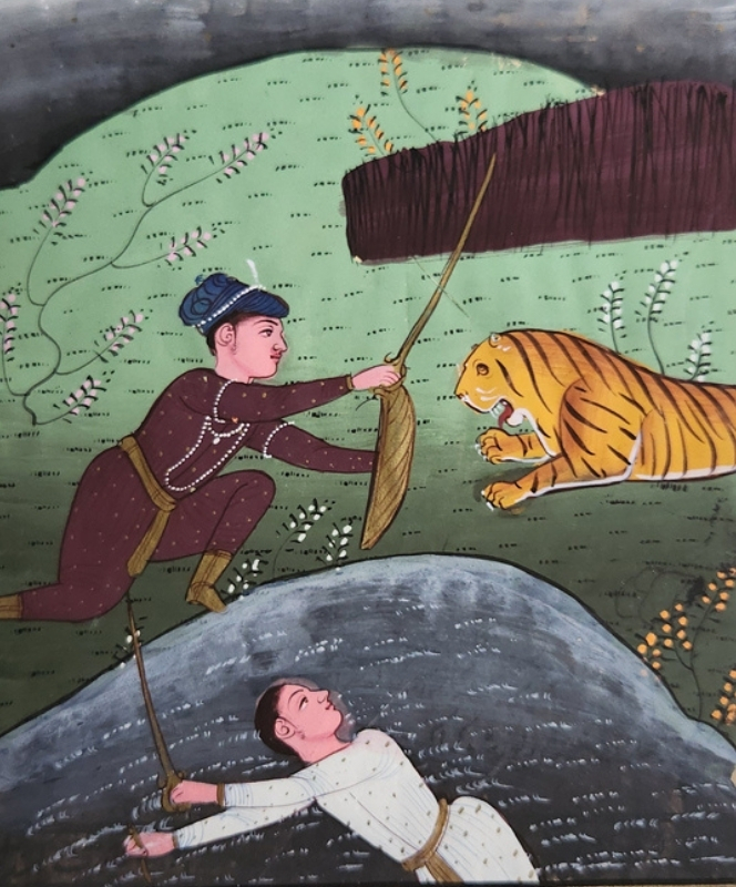 A traditional miniature painting depicting a dramatic encounter between two individuals and a tiger.