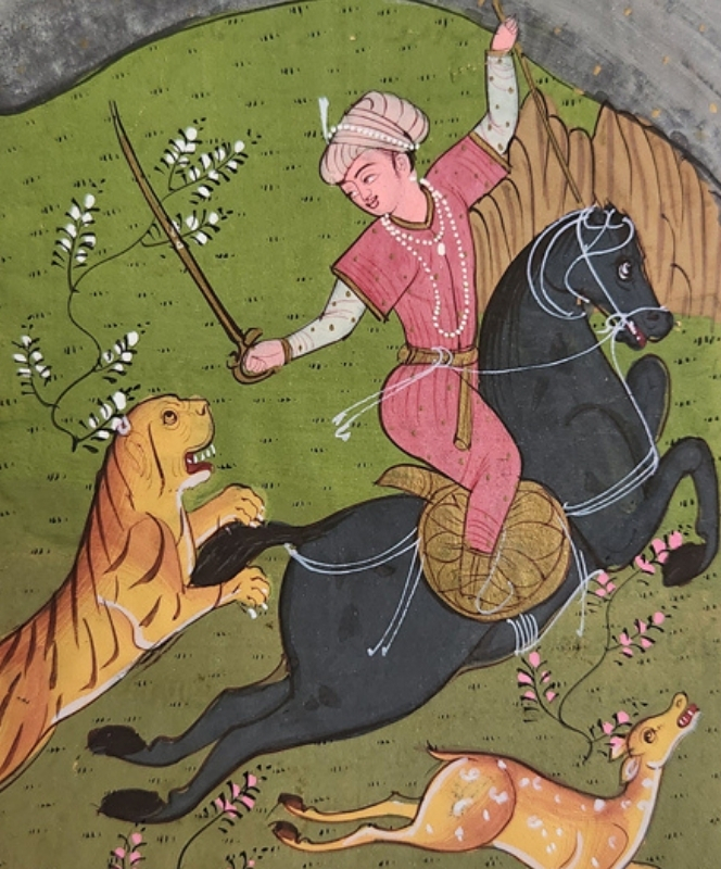 A vibrant miniature painting depicting a royal figure on horseback hunting a tiger and a deer.