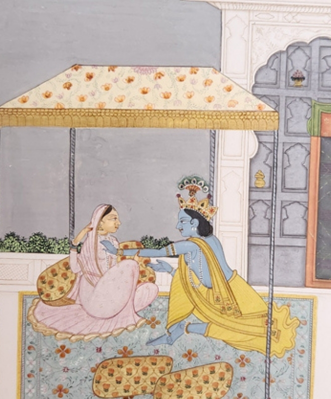 A detailed miniature painting depicting a royal couple engaged in an intimate moment under a canopy.