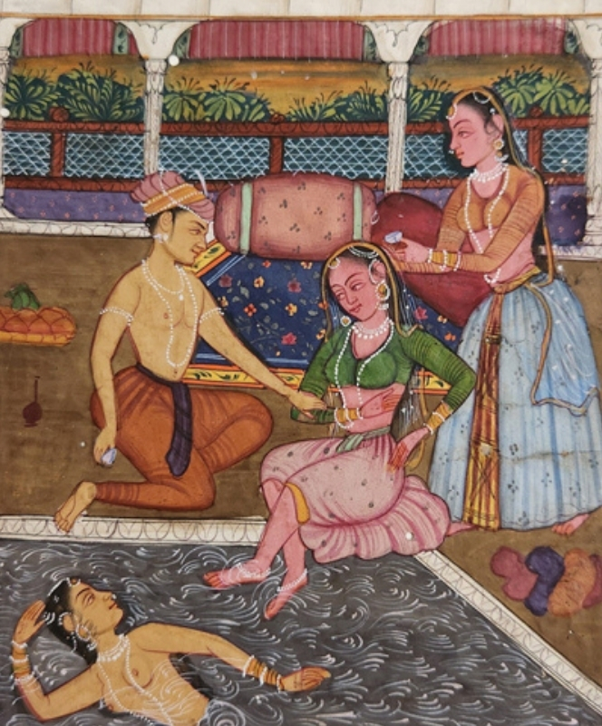 A detailed miniature painting depicting a royal bathing scene with intricate details and vibrant colors.