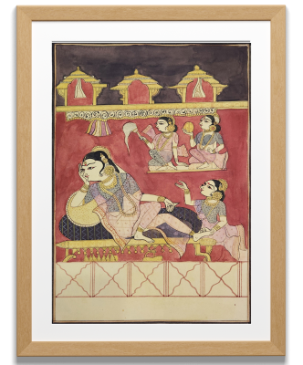A detailed miniature painting depicting a regal figure adorned in traditional jewelry and attire.