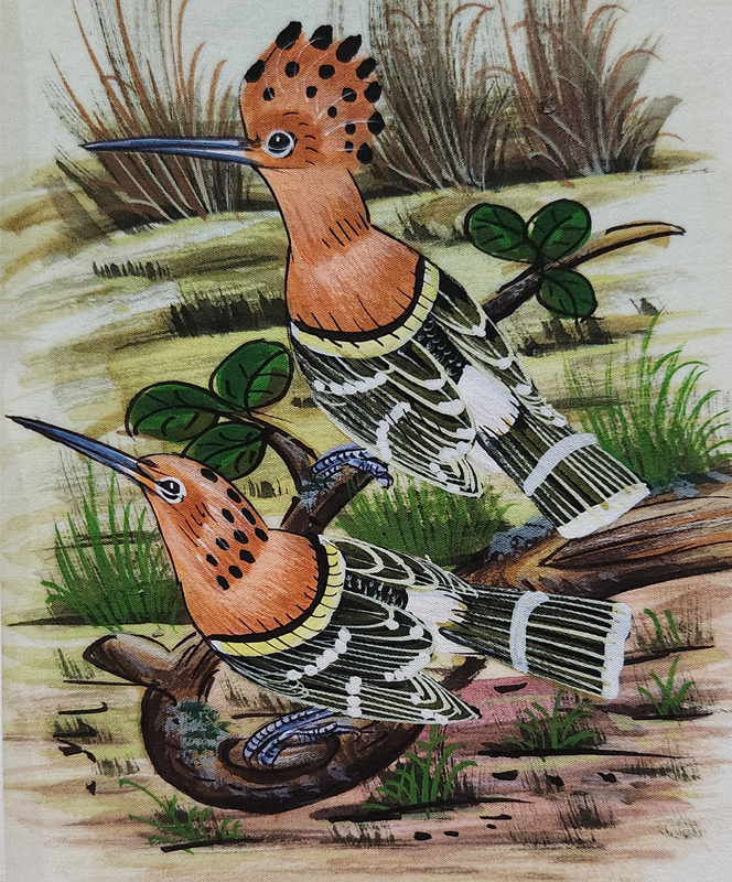 A vibrant watercolor painting depicting two hoopoes perched in a lush, natural setting.