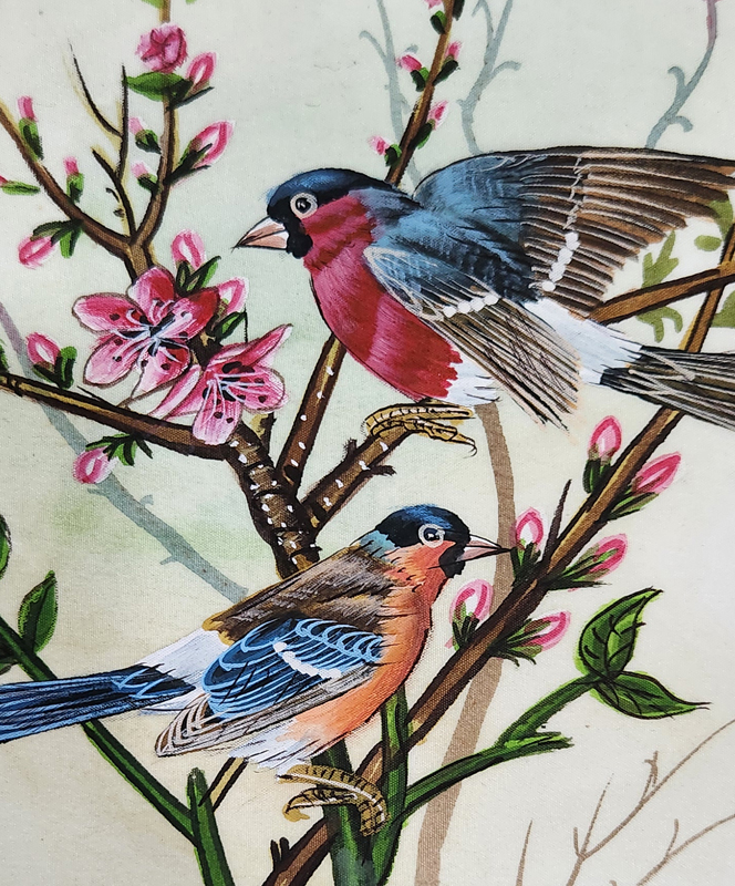 A vibrant watercolor painting depicting three colorful birds perched on budding branches.