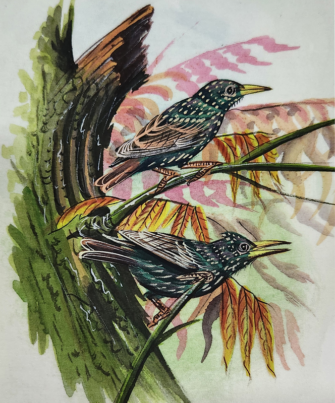 A vibrant watercolor painting depicting two starlings perched on colorful foliage