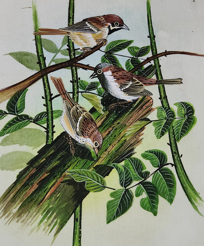 A delicate watercolor painting depicting three sparrows perched on branches amidst lush green foliage.