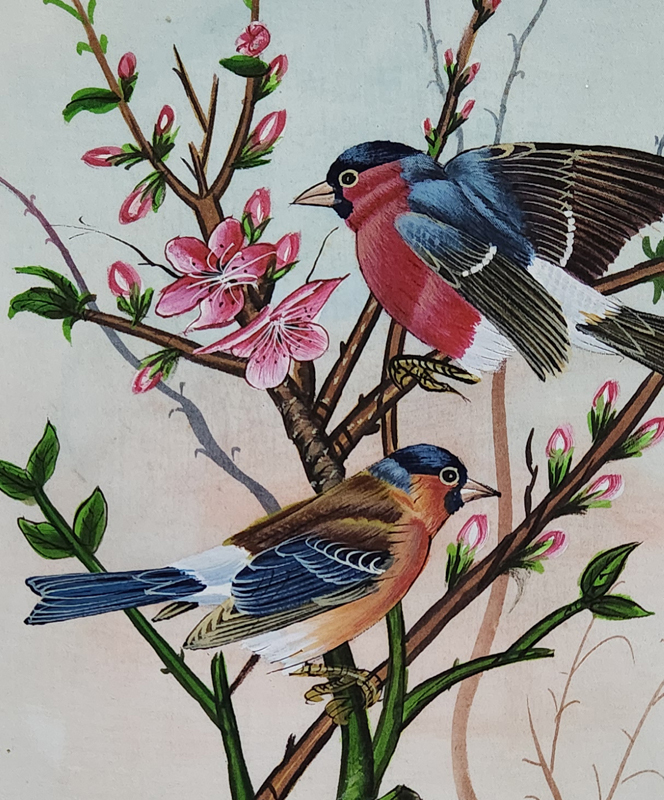 A vibrant watercolor painting depicting two colorful birds perched on blossoming branches.