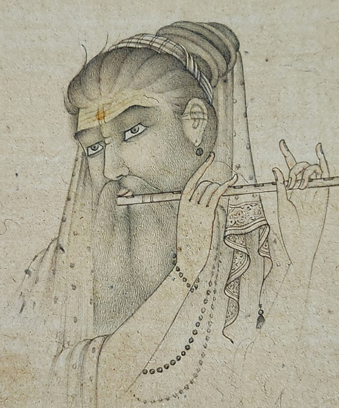 A delicate miniature painting depicting a figure playing a flute, adorned with traditional attire and jewelry.