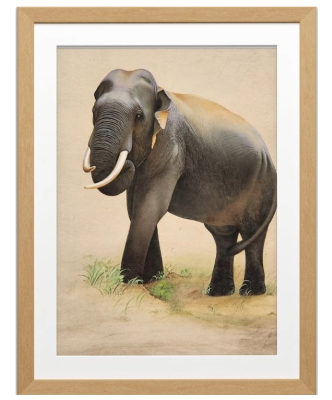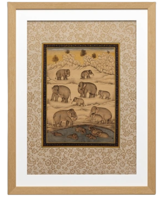 A detailed miniature painting of a regal elephant adorned with traditional ornaments, framed in an ornate golden frame.