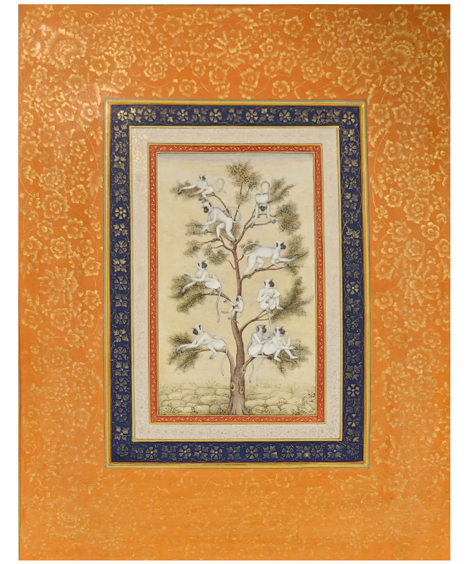 A striking miniature painting of playful monkeys set against a stunning gold background, capturing both elegance and whimsy.