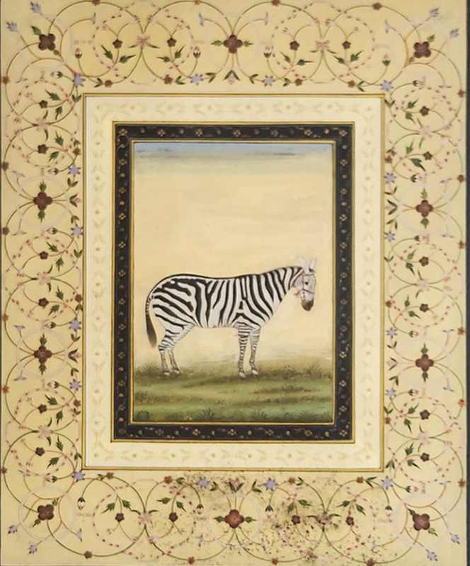 A miniature painting of a zebra standing on a grassy plain, surrounded by intricate floral patterns.