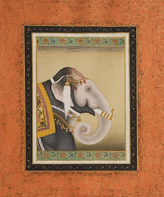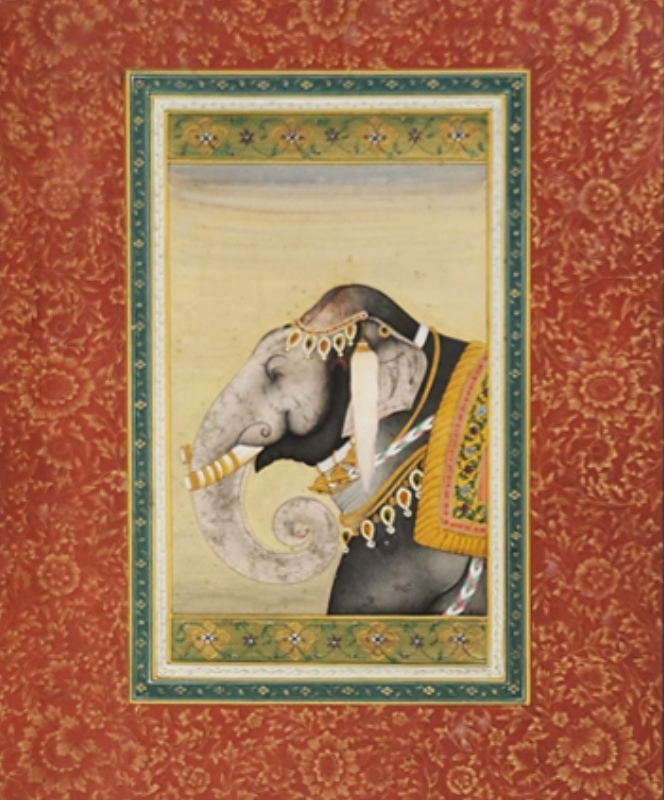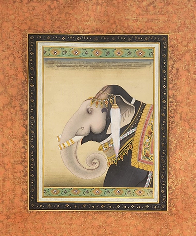 A detailed miniature painting of an adorned elephant in traditional attire, framed with intricate borders.