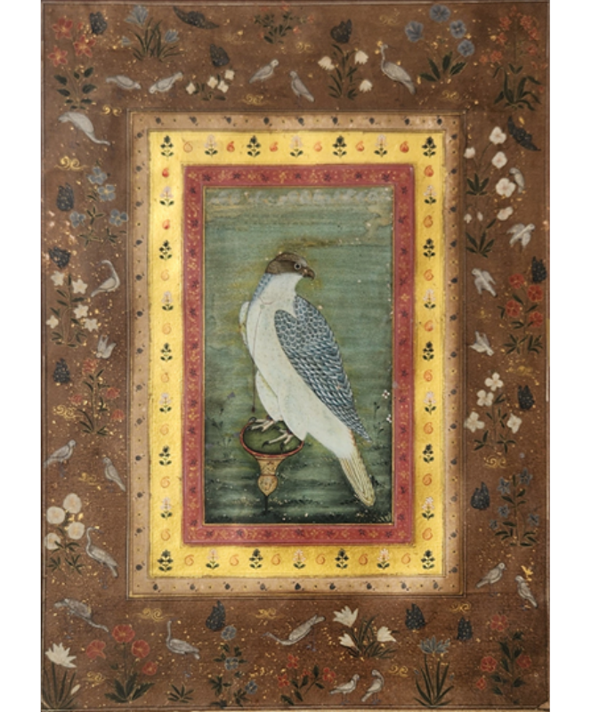 A detailed miniature painting of a falcon perched on a stand, surrounded by intricate floral and avian motifs.