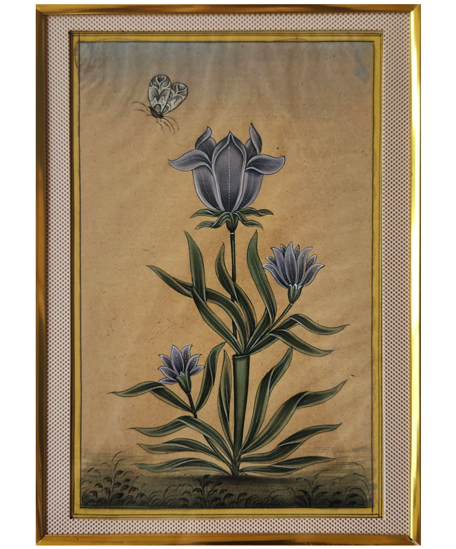 A delicate miniature painting depicting a butterfly hovering over a cluster of blue flowers.