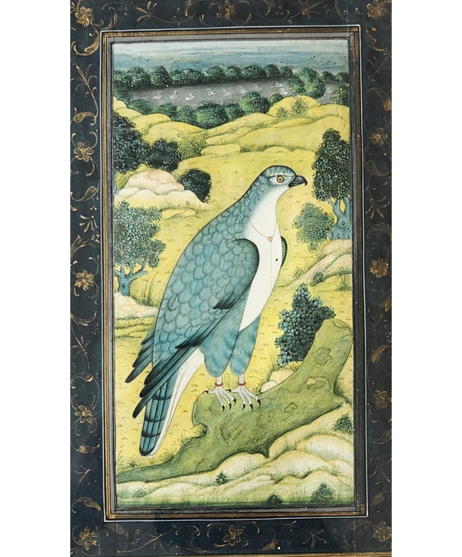 A detailed miniature painting of a falcon perched on a stand, surrounded by intricate floral and avian motifs.