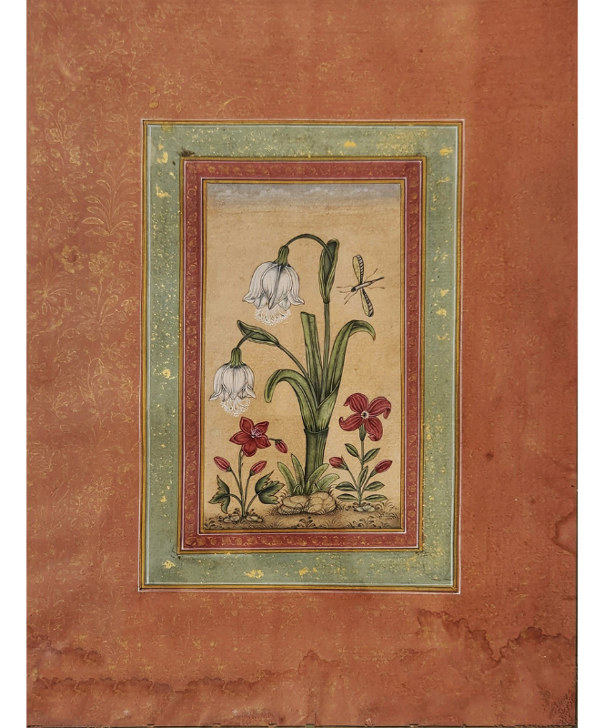 A delicate miniature painting depicting white bell flowers, red blossoms, and a dragonfly, framed in an ornate border.