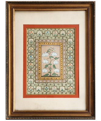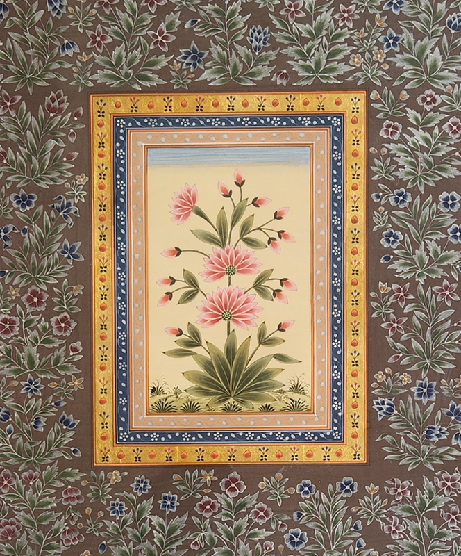 A Mughal-style miniature painting featuring a delicate floral motif framed by intricate geometric patterns.