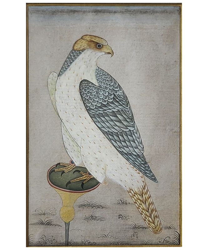A detailed miniature painting of a falcon perched on a stand, showcasing intricate artistry and natural elegance.