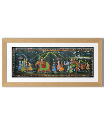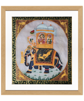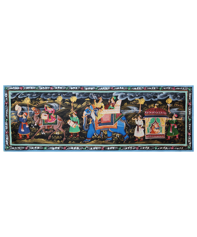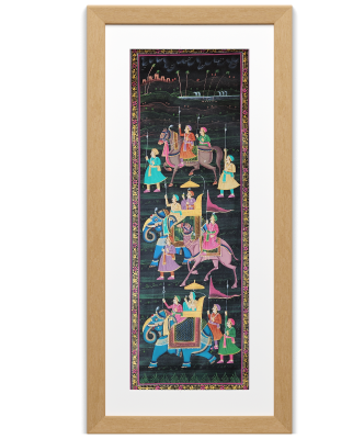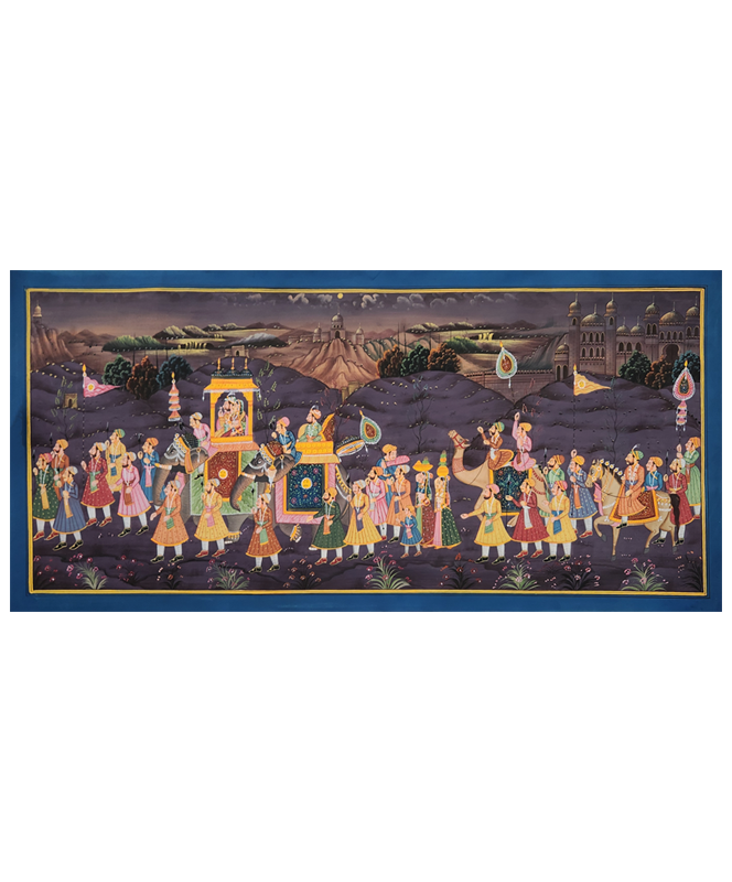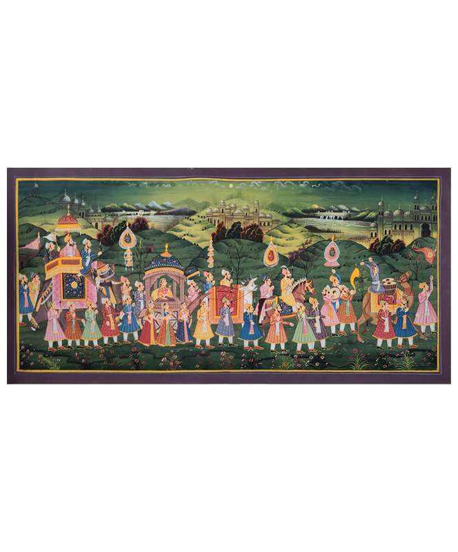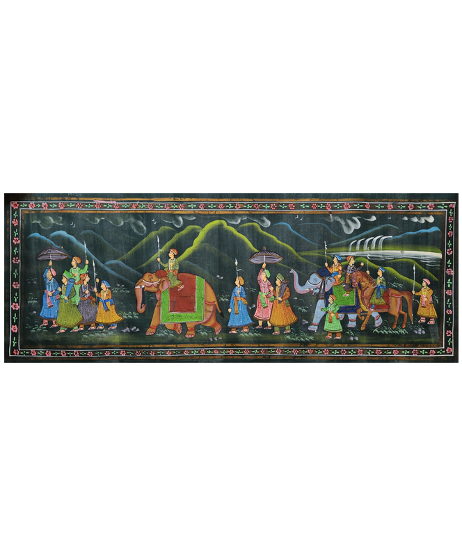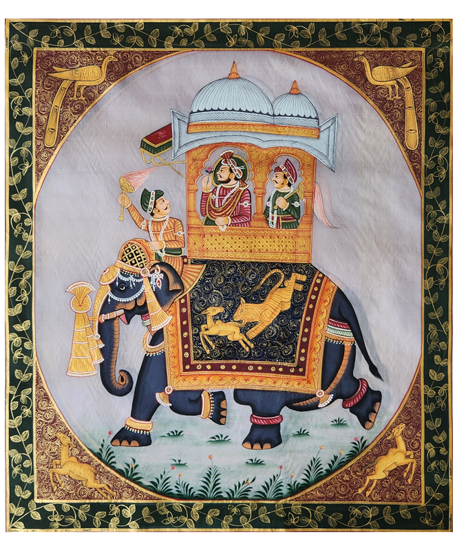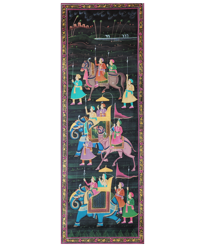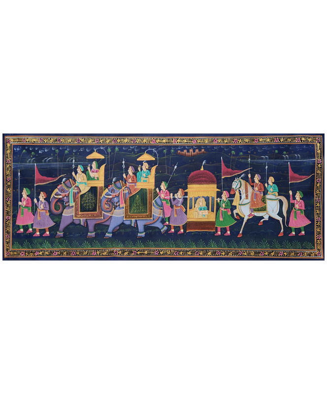 A regal silk composition portraying a royal elephant-led procession, hand-painted with traditional finesse using original mineral pigments