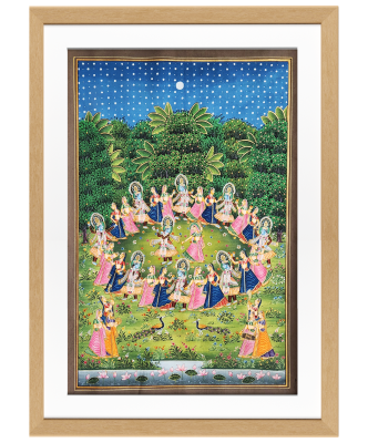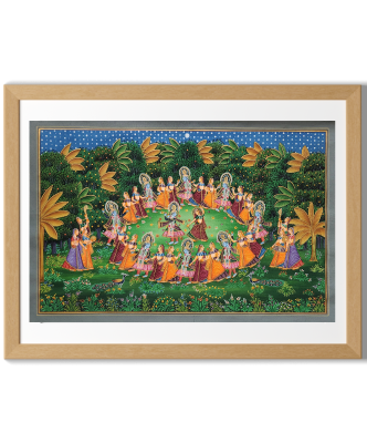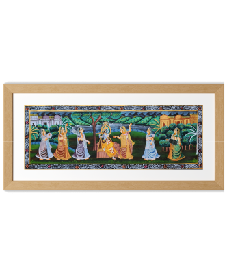 A vibrant silk depiction of a festive royal gathering set within grand architecture, hand-painted using original mineral pigments.