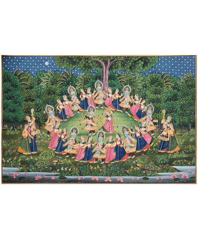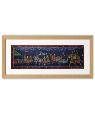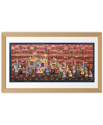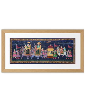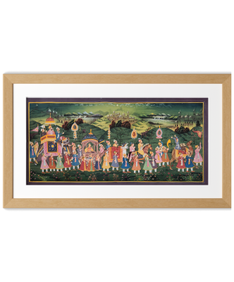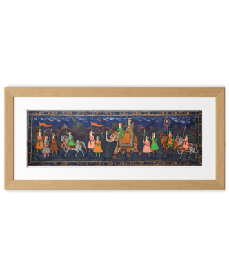 A regal silk composition portraying a royal procession in ceremonial grandeur, hand-painted with original mineral pigments.