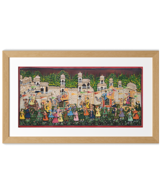 A luminous silk artwork capturing a vibrant royal procession beneath architectural grandeur, hand-painted with original mineral pigments.