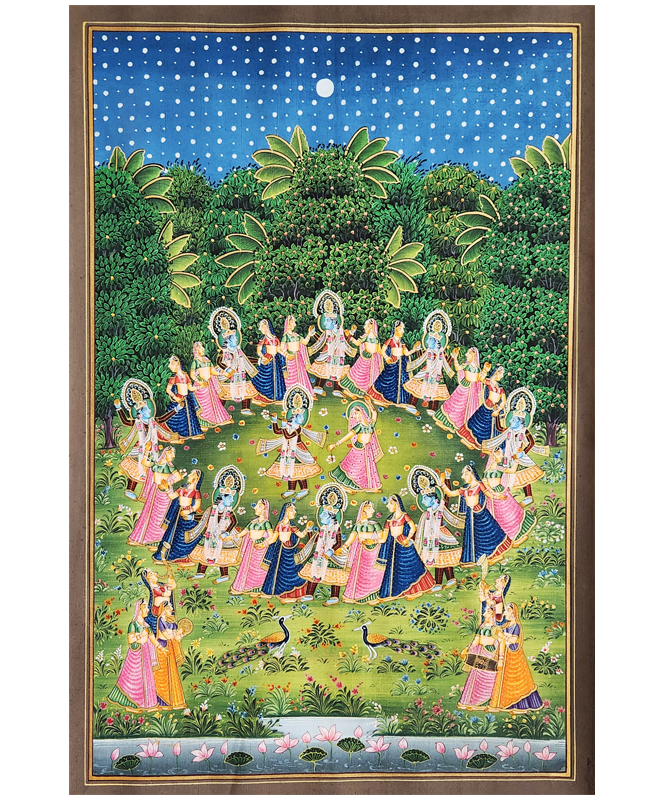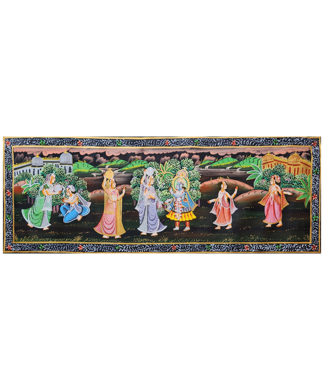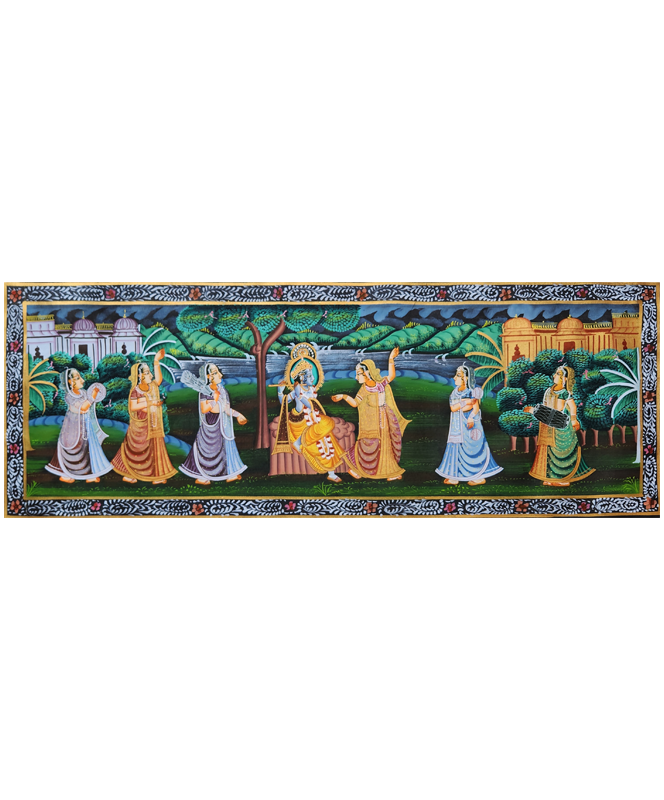 A wide-format silk painting portraying a rhythmic royal parade, hand-painted with miniature-style finesse using original mineral pigments