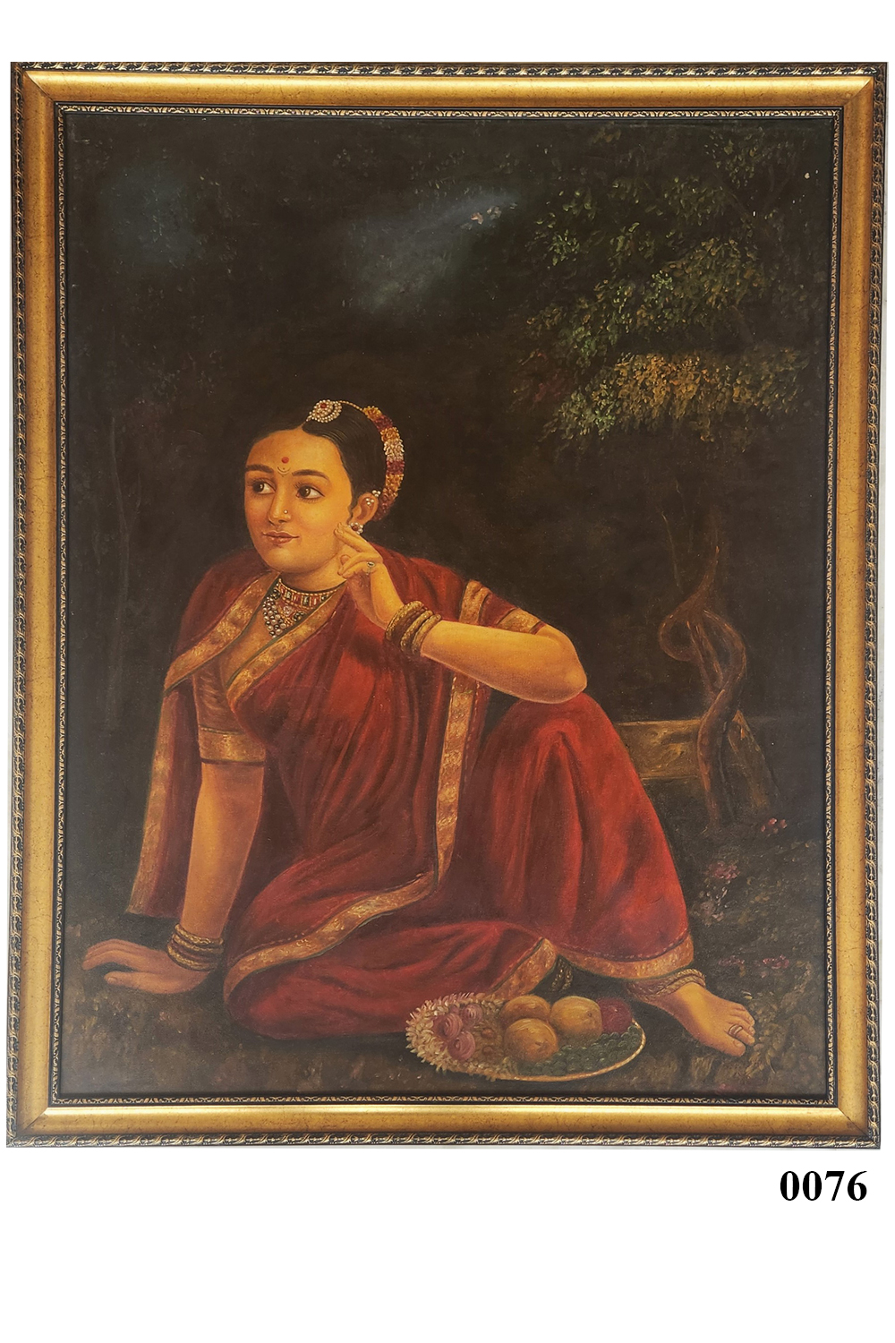 This exquisite oil painting captures the serene grace of a lady seated in quiet contemplation, wearing a traditional saree and delicate jewellery. The intricate detailing of her attire and adornments reflects the elegance of classical artistry. The soft tones and refined brushwork make this artwork a stunning centrepiece for any space, invoking a sense of calm and beauty.