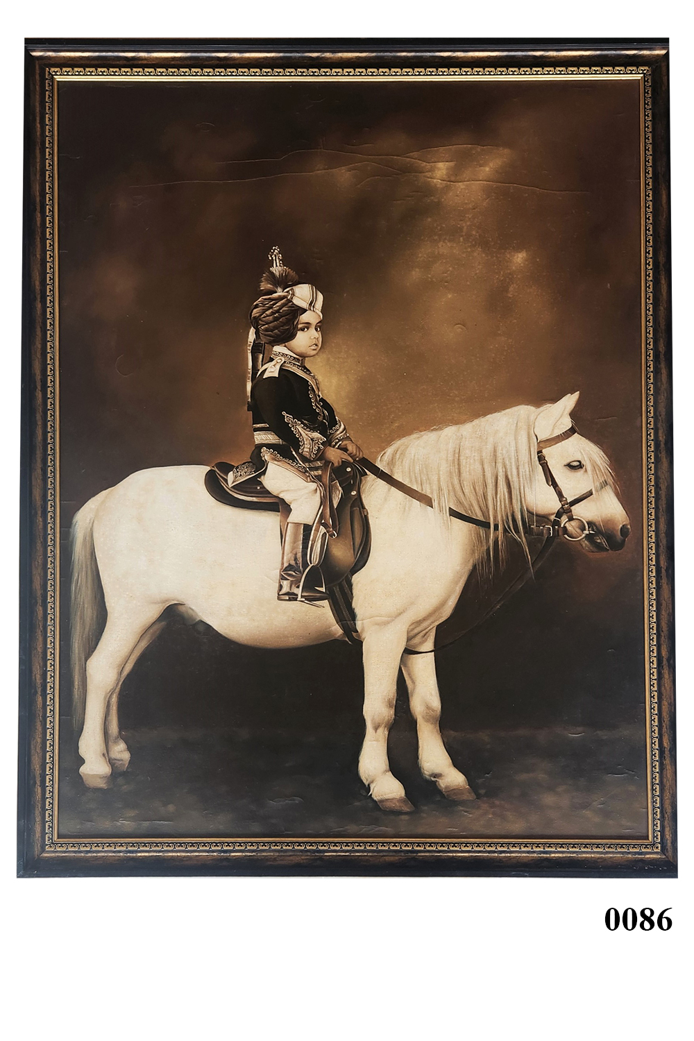 This oil painting depicts a regal scene of a king's son sitting gracefully on a horse, radiating power and nobility. The intricate details bring out the elegance of royal heritage, with bold strokes that highlight the grandeur of both the rider and his steed. A perfect piece to add sophistication and timeless charm to your collection.