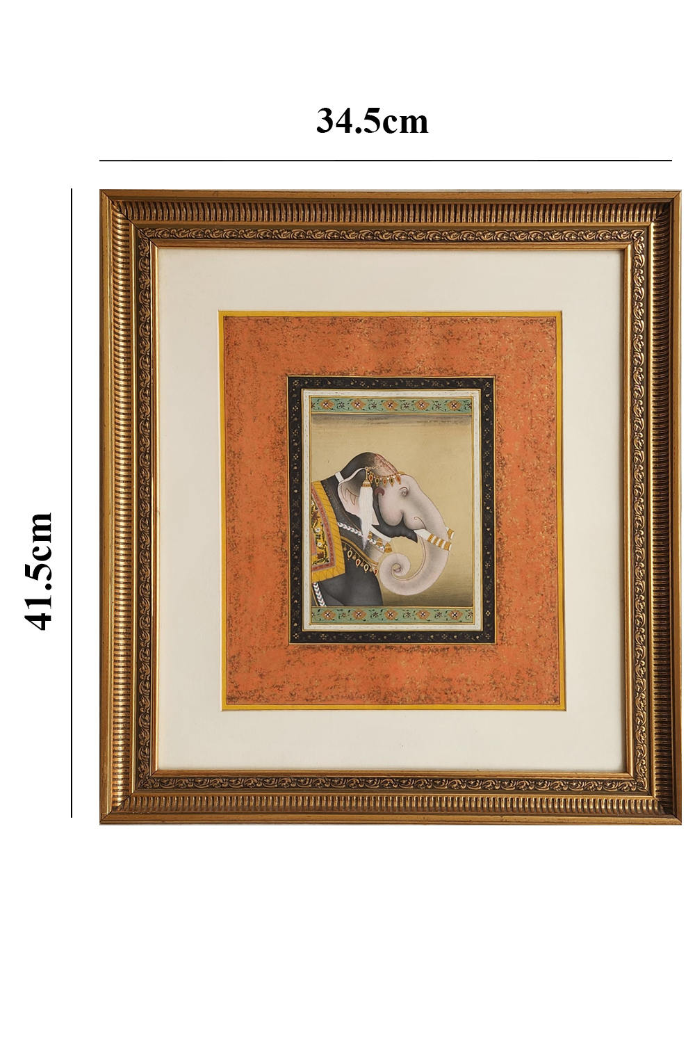 This exquisite miniature painting depicts a majestic elephant, richly adorned with traditional jewelry and a decorative headpiece. The elephant is shown in profile, highlighting its intricate adornments and the artist's attention to detail. The painting is set against a muted background, allowing the vibrant colors and patterns of the elephant's attire to stand out. The artwork is framed with a double border, featuring an inner frame with floral motifs and an outer frame with a textured orange pattern. The entire piece is encased in an ornate golden frame, adding to its regal appearance.