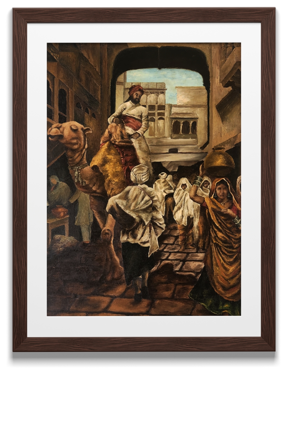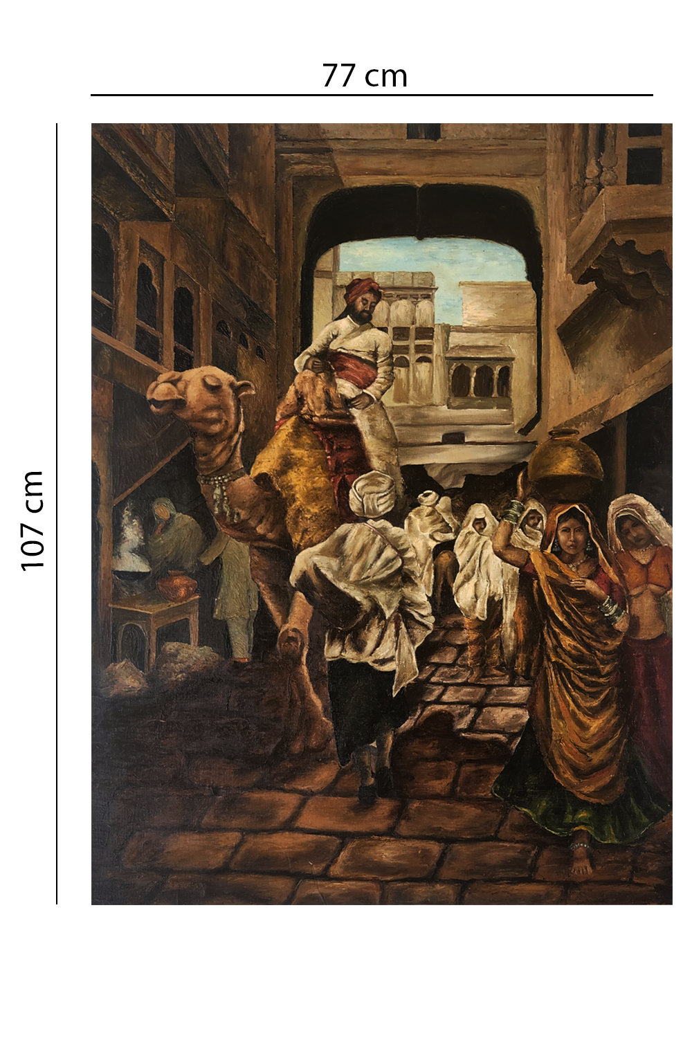 The painting conveys a sense of daily life and cultural richness in a historical desert town.