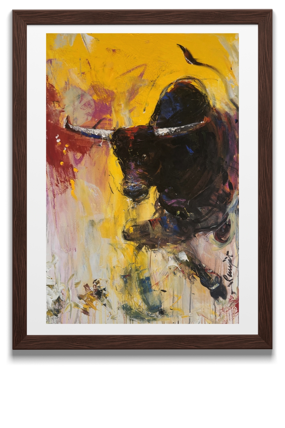 This striking oil painting, titled "Charging Bull," captures the raw energy and power of a bull in mid-charge. The artist employs a vivid palette dominated by yellows, reds, and dark hues to create a sense of movement and intensity. Key features include: