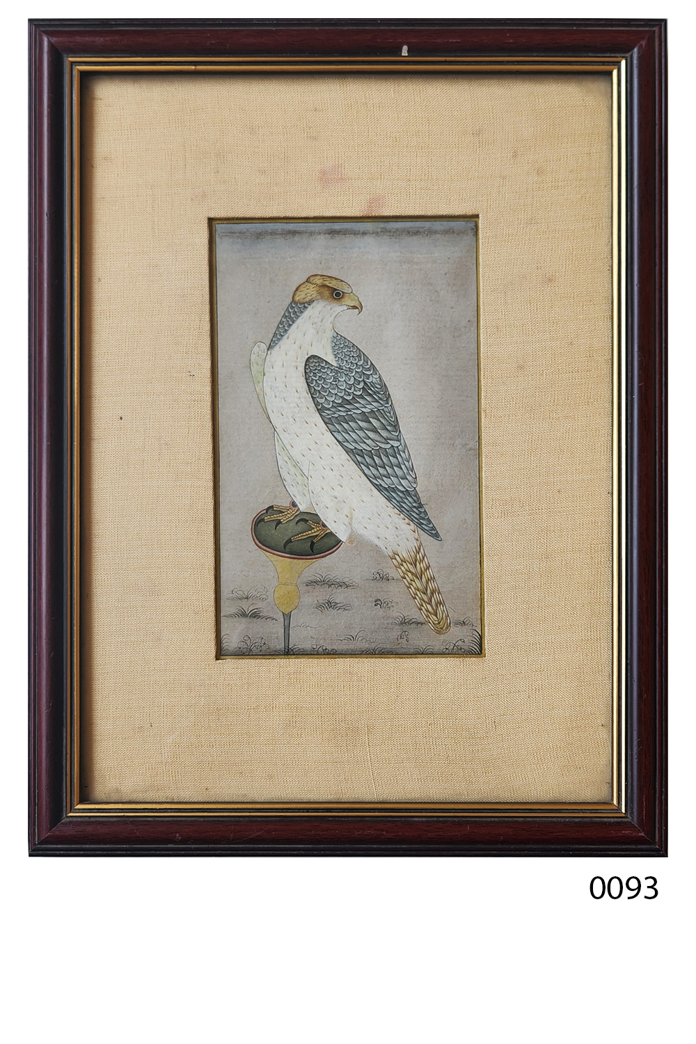This exquisite miniature painting features a regal falcon perched on a stand, rendered with meticulous detail and precision. The falcon's plumage is depicted with fine brushwork, highlighting the intricate patterns and textures of its feathers. The bird's posture exudes a sense of majesty and calm, with its head turned slightly to the side. The background is minimalistic, allowing the viewer to focus on the falcon's striking presence. The painting is framed in a simple yet elegant wooden frame with a gold inner border, enhancing its overall aesthetic appeal. Key features include:
