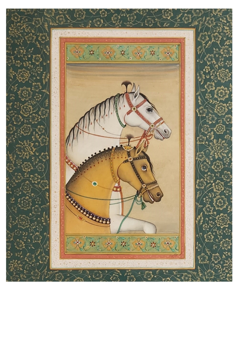 This exquisite miniature painting showcases two horses, one white and one brown, adorned with intricate bridles and harnesses, reflecting the regal aesthetics of Mughal art. The painting is framed with a detailed floral border in green and gold, enhancing its elegance. The horses are depicted with meticulous attention to detail, highlighting their majestic presence. The background features a subtle gradient, adding depth to the composition. The frame itself is ornate, with a golden pattern that complements the artwork. This piece exemplifies the rich tradition of Mughal miniature painting, known for its precision and decorative elements.