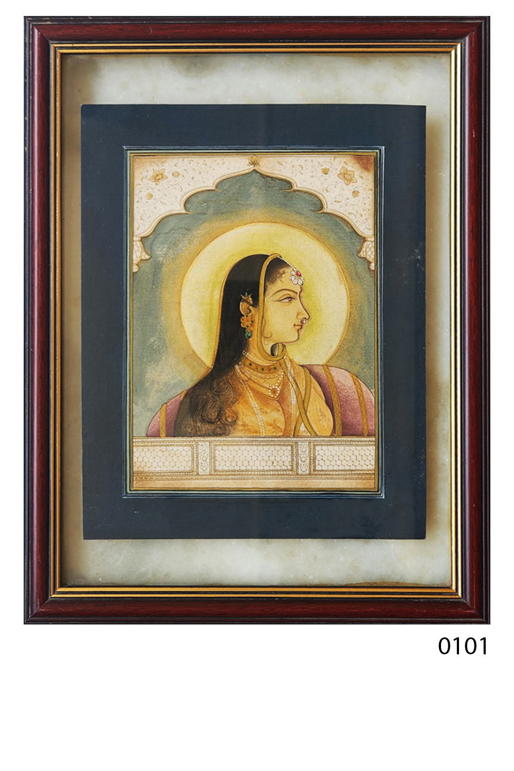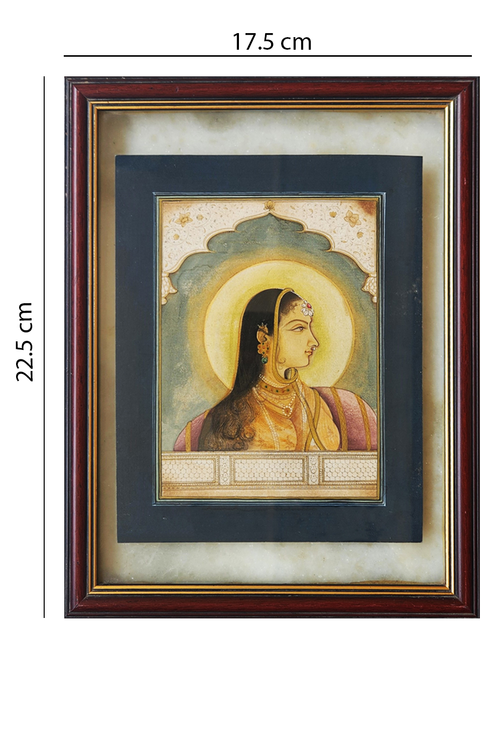 This exquisite miniature painting showcases a regal lady, possibly of royal descent, adorned in traditional Indian attire. The painting features: