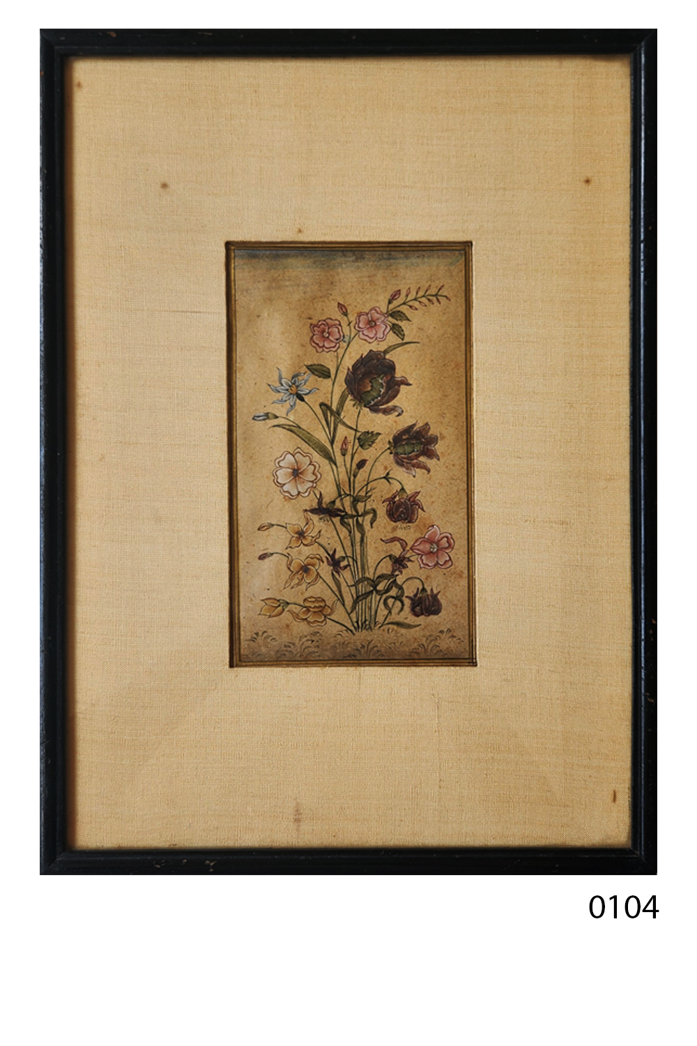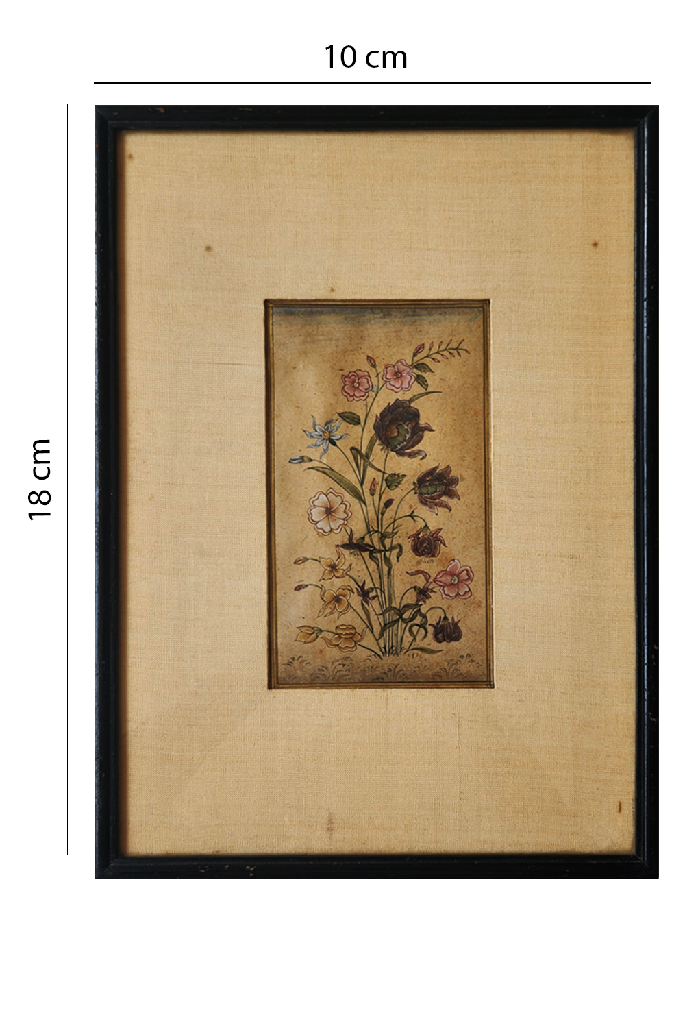 This exquisite miniature painting showcases a vertical arrangement of diverse flowers, each meticulously detailed. The painting is framed in a simple black frame with a beige matting that enhances the artwork's elegance. The flowers are rendered in soft, natural colors, with intricate detailing on the petals and leaves. The background has a subtle, aged texture, adding to the painting's vintage charm. The overall composition is balanced and harmonious, making it a captivating piece for any art lover.