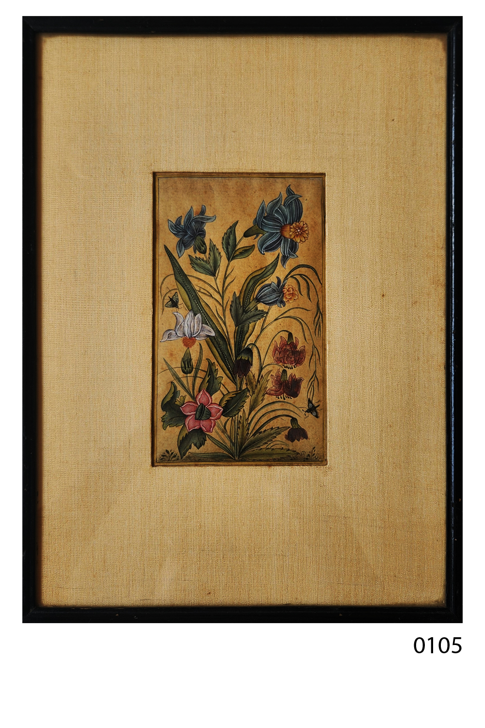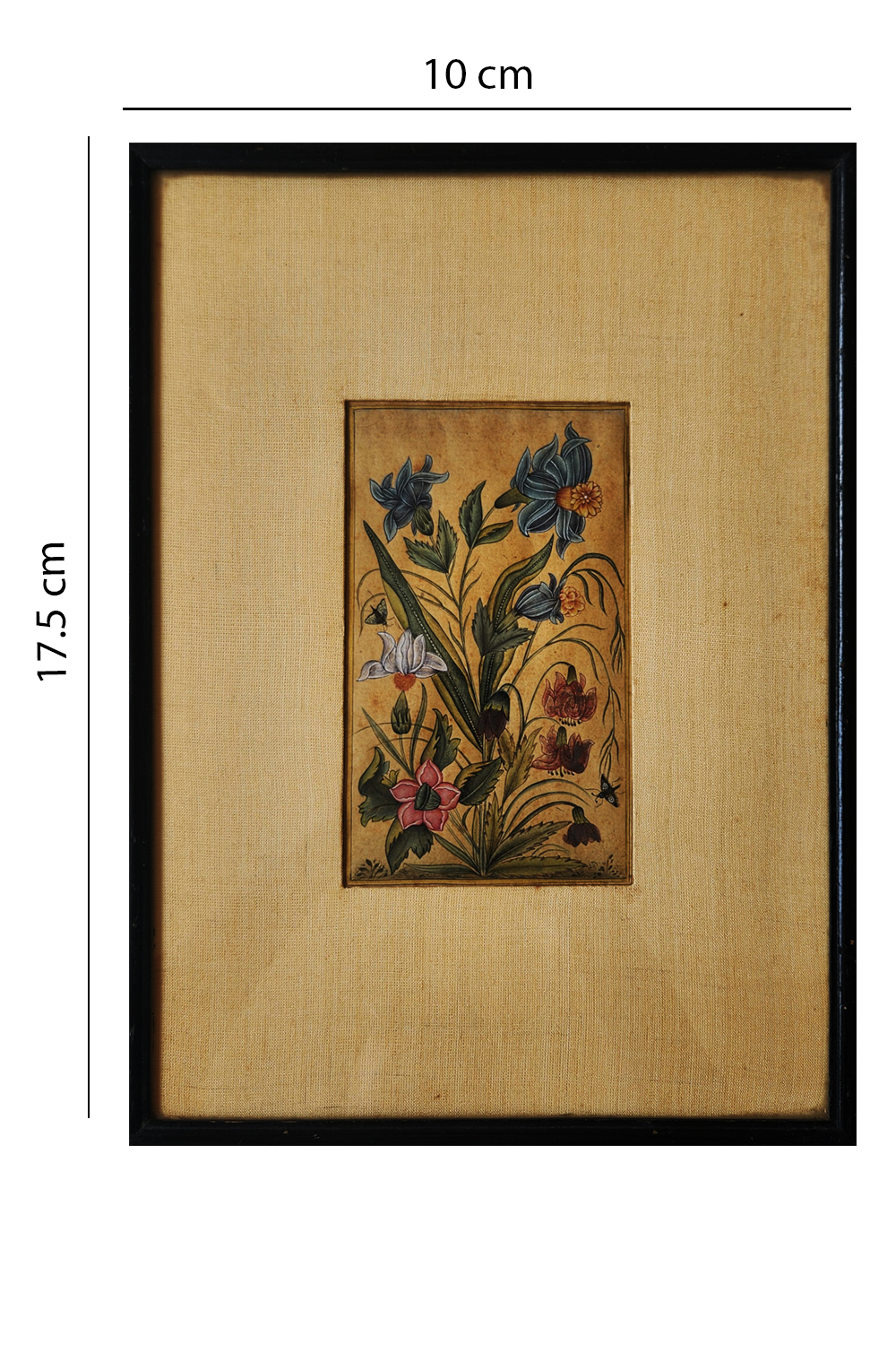 This exquisite miniature painting showcases a beautifully detailed arrangement of flowers, each rendered with meticulous attention to color and form. The painting features: