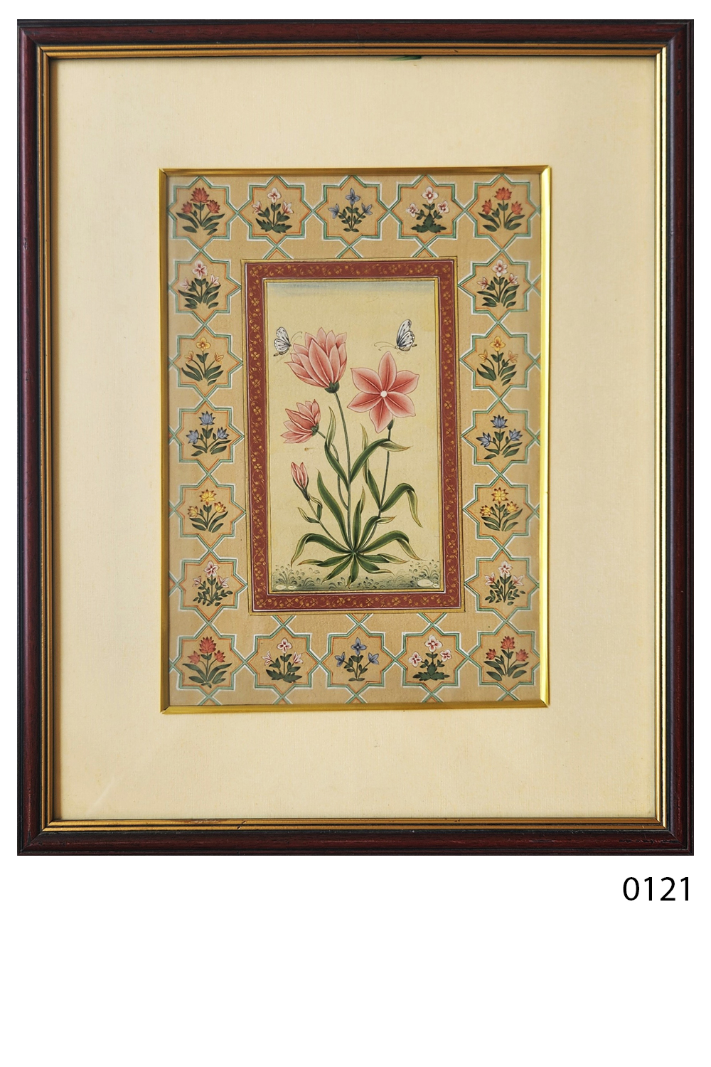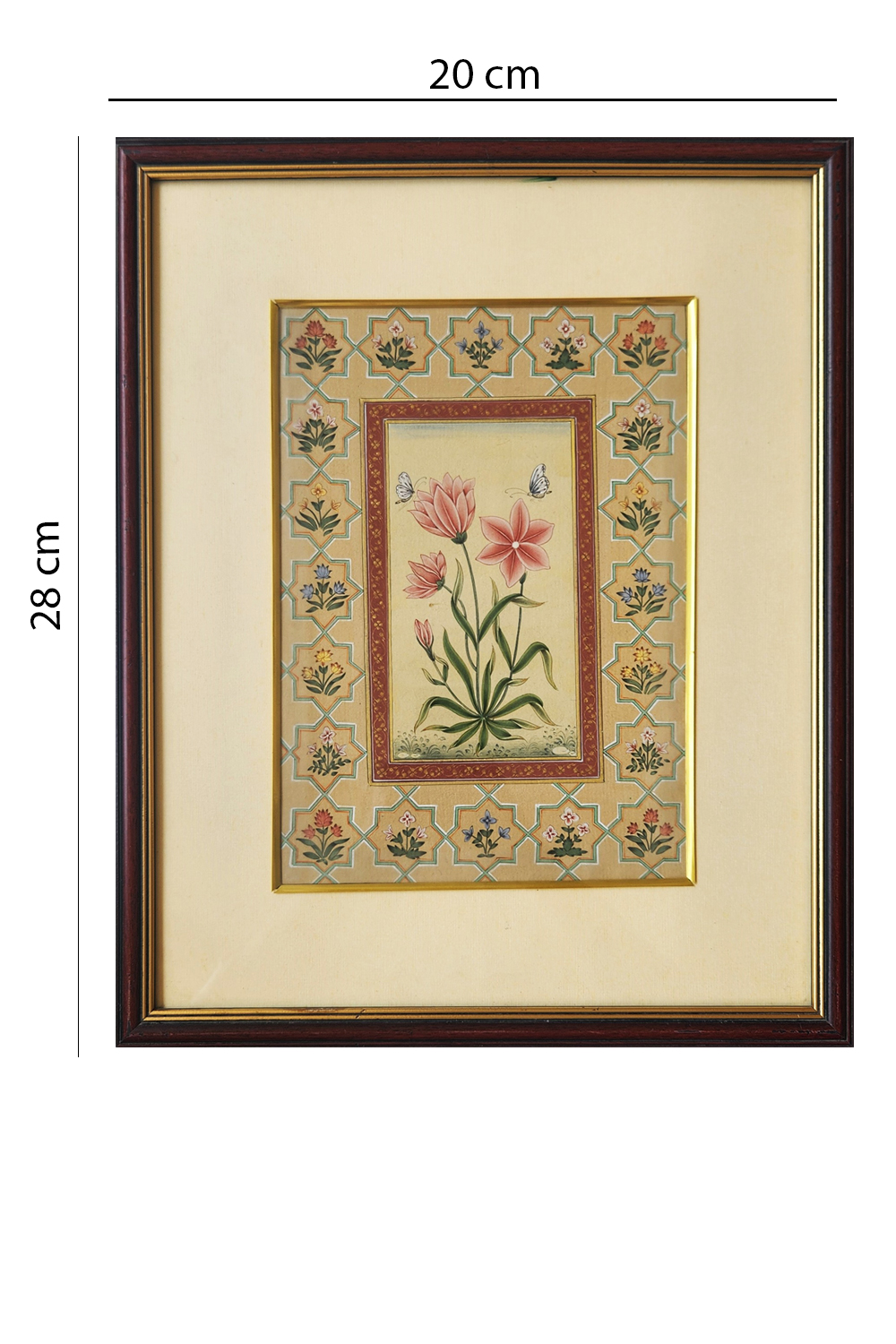This exquisite miniature painting showcases a central composition of blooming tulips with two butterflies hovering around them. The tulips are painted in soft pink and red hues, with detailed green leaves and stems. Surrounding the central image is an ornate border adorned with various small floral motifs, each meticulously detailed and colored. The background of the painting is a subtle beige, enhancing the vibrancy of the flowers and butterflies. The painting is framed in a classic wooden frame with a golden inner lining, adding a touch of elegance and sophistication.