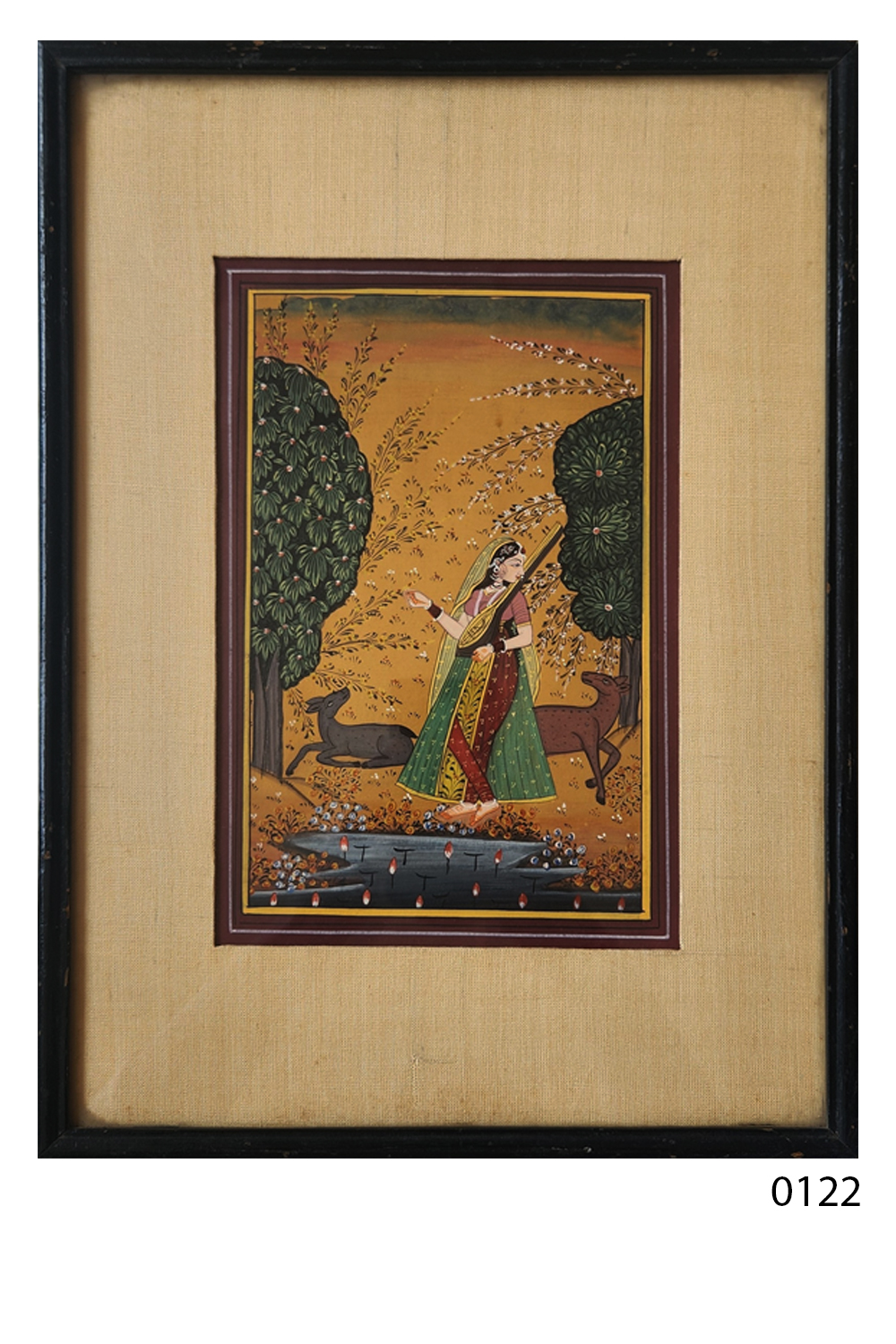 This exquisite miniature painting captures the essence of classical Indian art, showcasing a lady adorned in traditional attire playing a veena. The background features a lush forest with two deer, adding to the tranquil ambiance. The painting is rich in detail and color, with the following notable features: